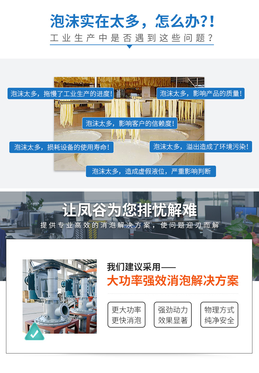 凤谷节能科技根据污水处理、石油、化工、纺织、电镀、PCB、造纸、食品、医药等行业应用场景和消泡需求,为企业提供大功率强效消泡解决方案,适用于搅拌、萃取、清洗、过滤、发酵、干燥、分离、浓缩、破碎等工艺环节。
